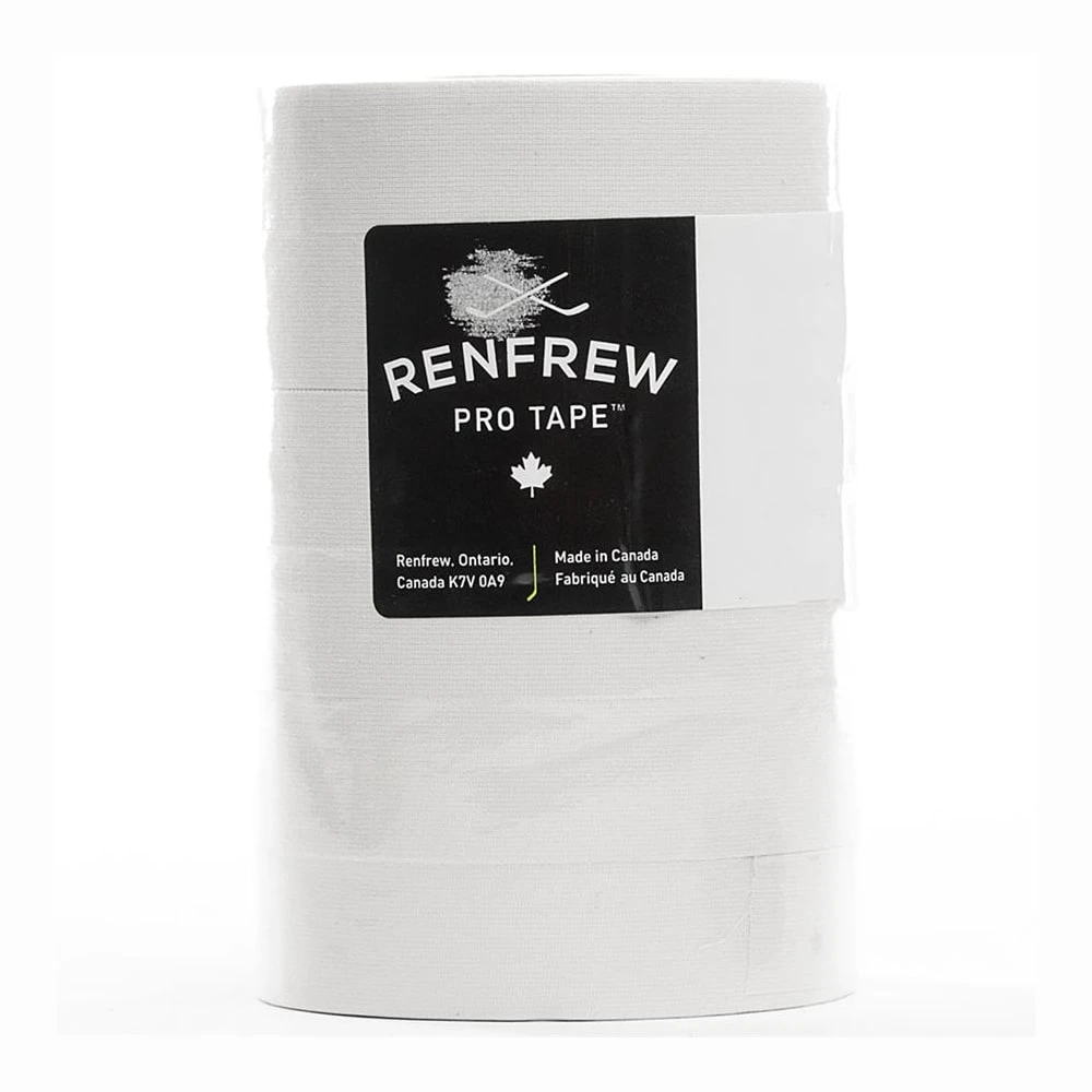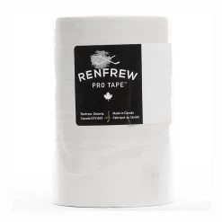 - Renfrew’s tape is a thick woven cotton cloth tape that has a more consistent coating of adhesive creating a moisture barrier between the ice and stick, resulting in better adhesion and a longer lasting product. This is made spesfically for your hockey stick and not suggested for use on your shin guards.